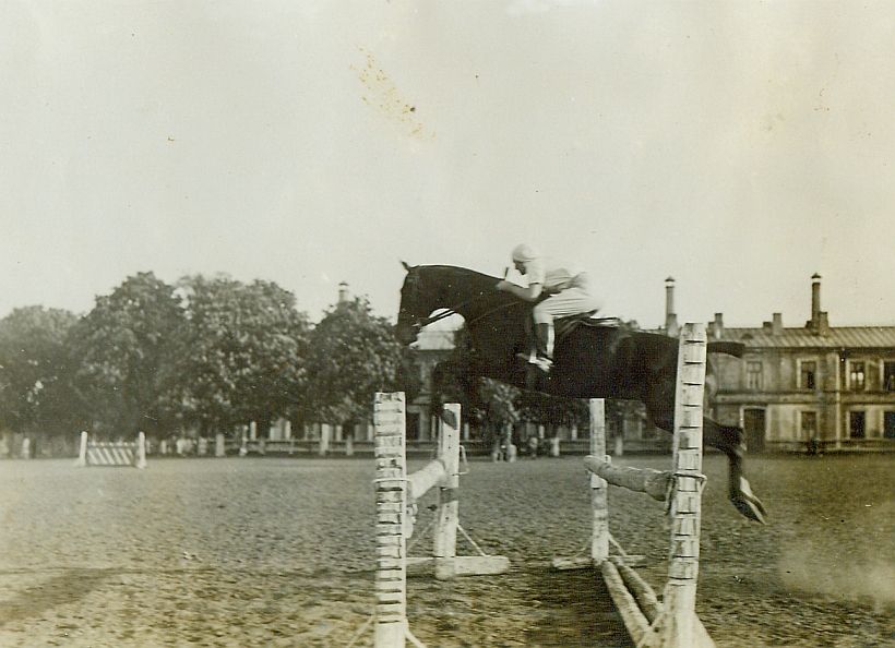 | Nr. inwentarzowy: MŁJ-XVI 1756 / 01 / 012 opis: Trening przed warszawskimi konkursami. Anna Leska w skoku przez okser na koniu Neptun. Kobieta w jasnym stroju jeździeckim, w tle inna przeszkoda, piętrowy budynek, drzewa.data: maj 1933 r.czas powstania - daty graniczne: 1933-05-01 - 1933-05-31miejsce: Warszawa, ujeżdżalnia 1 Dywizjonu Artylerii Konnejosoby: Anna Leska 1910-1998 ("Anka", członkini K.S.R.W.; później Leska-Daab, podczas II wojny światowej pilot w Wielkiej Brytanii).inne nazwy własne: Klub Sportowy Rodziny Wojskowejtworzywo: papier fotograficzny, błyszczącytechnika: odbitka żelatynowo-srebrowa DOP, czarno-białazespół: album rodziny Bohdanowiczówwymiary (wys. x szer.): 88 x 117 [mm] Koń: 1. Neptun, wałach - koń z kurtyzowanym ogonem, na którym w 1933 r. startowała Anna Leska
