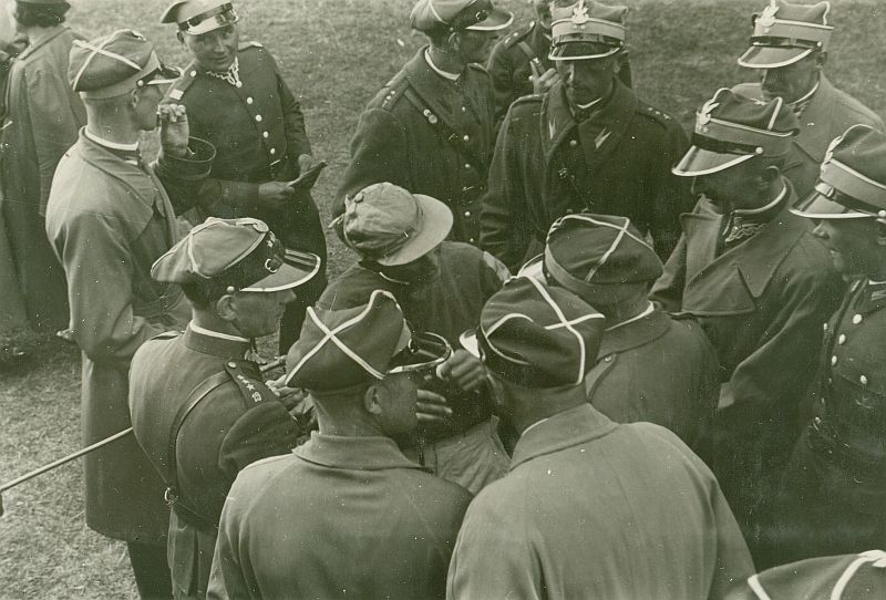 | Nr. inwentarzowy: MŁJ-XVI 1758 / 00 / 025 opis: Tor wyścigów konnych. Rtm. Michał Bohdanowicz (w stroju wyścigowym, własne barwy) wśród kilkunastu wojskowych - kolegów po wygraniu na Bakaracie Steeple-chase im. Ministra Rolnictwa i Reform Rolnych. Zdjęcie z góry (z trybuny?).czas powstania - daty graniczne: 1935-07-07 - 1935-07-07miejsce: Wilno, Pośpieszkaosoby: Rtm. Michał Bohdanowicz 1903-48 (syn Jana Bohdanowicza i Marii z Cywińskich. W latach 1932-36 i przed II wojną w 4 p.u., nazywany "Misiem").tworzywo: papier fotograficzny, błyszczącytechnika: odbitka żelatynowo-srebrowa DOP, czarno-białazespół: album rodziny Bohdanowiczówwymiary (wys. x szer.): 86 x 125 [mm] Koń: 1. Bakarat, ogier, rasa: xx, maść kasztanowata, ur. 1925 - (od 1934 wałach), Harsona – Balata, hod. Romana Czaykowskiego, wł. K. Dzierzbickiego, później Z. Cierpickiego. Startował w l. 1927-1937 w gonitwach płaskich, płotowych i przeszkodowych (prawie 100x, 1/3 zwycięstw) na torach w Baranowiczach, Łodzi, Wilnie, Bydgoszczy, Poznaniu, Kielcach, Radomiu, Lublinie, Warszawie. Dosiadali go: M. Bohdanowicz, por. Kwieciński, j. Ustinow, j. Gajewski, dż. Kucharski; trenerzy: S. Kowalski, Z. Cierpicki, S. Balcer, M. Bohdanowicz., na zdjęciu: nie ma go na zdjęciu, 1. miejsce