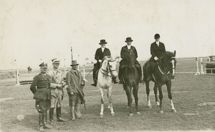 | Nr. inwentarzowy: MŁJ-XVI 1641 / 00 / 022 opis: Zawody organizowane przez Komitet Targów Końskich w Gnieźnie, po konkursie. Plac konkursowy, na stojących koniach: H. Tuska (Obawa), R. Brökere (Morus) i W. Harlandowa (Tanina). Obok stoi 2 oficerów (może: płk J. Bold i rtm. L. Kon) i cywil. W tle przeszkody. W parach startowali z paniami niewidoczni: Gutowski, Paszotta i Brabec.czas powstania - daty graniczne: 1934-05-03 - 1934-05-03miejsce: Gniezno, hipodrom Komitetu Targów Końskich w Gnieźnieosoby: Halina Tuska (1910-1977, Leszno), Wanda Harlandowa (Bydgoszcz), Romana (Roma) Brökere (1909-2001, Strumiany, później Daszkowska), być może: płk Jan Maciej Bold i rtm. Leon Koninne nazwy własne: prawdopodobnie: Konkurs parami Imienia JWPana Prezydenta Poznańskiego Ziemstwa Kredytowego Józefa Żychlińskiego w Poznaniu, wys. ok. 100 cm, szer. do 250 cm, w którym panie zdobyły 3 pierwsze miejsca na tych koniachtworzywo: papier fotograficzny, półbłyszczącytechnika: odbitka żelatynowo-srebrowa DOP, czarno-białazespół: album rodziny Brökerewymiary (wys. x szer.): 89 x 139 [mm] Konie: 1. Morus, wałach, maść kasztanowata - hod. nieznana, wł. płk. Brabec 2. Tanina, klacz, maść gniada, ur. 1925 - hod. L. Zembrzuski, Moniaki, wł. mjr. Henryk Harland, na zdjęciu: 9 lat 3. Obawa, klacz, maść siwa - hod. Grabowski, Rudzice, wł. por. Maksymilian Tuski (mąż p. H. Tuskiej)