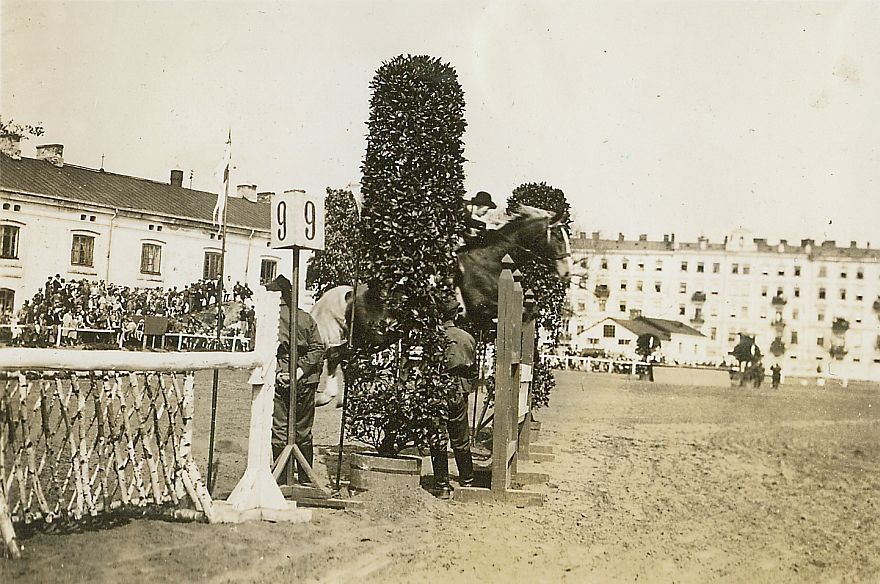 | Nr. inwentarzowy: MŁJ-XVI 1744 / 00 / 051 opis: Konkurs Klubu Sportowego Rodziny Wojskowej. Przez doublebarre nr 9 skacze Zofia Kucińska na koniu Łuk. Przeszkoda zasłania konia i amazonkę (widać melonik). Przy przeszkodzie 2 żołnierzy, donice z zielenią, inna przeszkoda. W tle ogrodzenie, budynki.czas powstania - daty graniczne: 1931-05-14 - 1931-05-14miejsce: Warszawa, ujeżdżalnia Szwadronu Sztabowegoosoby: Zofia Kucińskatworzywo: papier fotograficzny, błyszczącytechnika: odbitka żelatynowo-srebrowa DOP, tonowana?zespół: album rodziny Leskichwymiary (wys. x szer.): 61 x 89 [mm] Koń: 1. Łuk, wałach