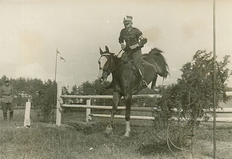 | Nr. inwentarzowy: MŁJ-XVI 1758 / 00 / 039 opis: Tor wyścigów konnych, Konkurs Otwarcia. Przeszkodę - wachlarz na suchym rowie - skacze rtm. Michał Bohdanowicz na koniu Talar III (zwycięzcy konkursu). Jeździec w mundurze, na lewym ramieniu opaska z numerem 12. Przy przeszkodzie stoi żołnierz, w tle płotek, żywopłoty, zagajnik.czas powstania - daty graniczne: 1935-07-04 - 1935-07-04miejsce: Wilno, Pośpieszkaosoby: Rtm. Michał Bohdanowicz 1903-1948 (syn Jana Bohdanowicza i Marii z Cywińskich. W latach 1932-1936 i przed II wojną w 4 Pułku Ułanów Zaniemeńskich, od 1936 w 13 Pułku Ułanów Wileńskich; nazywany "Misiem"; miłośnik wyścigów płotowych, przeszkodowych i biegów na przełaj).tworzywo: papier fotograficzny, błyszczącytechnika: odbitka żelatynowo-srebrowa DOP, czarno-białazespół: album rodziny Bohdanowiczówwymiary (wys. x szer.): 86 x 125 [mm] Koń: 1. Talar III, wałach, maść kasztanowata - hod. Bogumiła Hebanowskiego; ur. przed 1928, prywatny koń Michała Bohdanowicza, który startował na nim w konkursach ujeżdżenia, skoków (np. Mitingi Popularne PZJ 1938-39 i WKKW ("Militari"), biegach myśliwskich, skiringu, uczestniczył w ćwiczeniach wojskowych. Dosiadała go też żona Michała - Wanda (m.in. w 1937 r. w Grudziądzu).., na zdjęciu: 1. miejsce