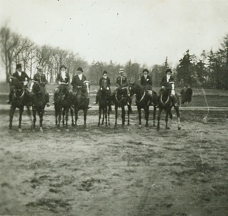 | Nr. inwentarzowy: MŁJ-XVI 1744 / 00 / 010 opis: Bieg św. Huberta urządzony przez pp. Skarżyńskich - zbiórka? Ośmioro jeźdźców na koniach stoi w szeregu: 2 cywili, 2 oficerów i 4 kobiety (w tym W. Leska na koniu Kazik). Uczestnicy w strojach jeździeckich (ciemne fraki i meloniki, jedna z kobiet w nakryciu głowy bez daszka) i mundurach. Błotnisty plac. Z tyłu 2 osoby, w tle drzewa.czas powstania - daty graniczne: 1930-11-09 - 1930-11-09miejsce: Warszawa, Wilanów?osoby: w środku, najdalej Wanda Leska (1908-1991)tworzywo: papier fotograficzny, błyszczącytechnika: odbitka żelatynowo-srebrowa DOP, czarno-białazespół: album rodziny Leskichwymiary (wys. x szer.): 59 x 60 [mm] Koń: 1. Kazik, wałach, maść skarogniada, ur. 1925 - Rock-Roy – Merilla, hod. H. Jechalskiego, wł. Wandy Leskiej-Bohdanowicz; w 1930 roku właścicielka trenowała go na ujeżdżalni W.S.Woj., startowała na nim m.in. w Warszawie, podczas Krajowych Zawodów Konnych w 1932 r.; w 1933 r. wygrywali na nim biegi przełajowe M. Bohdanowicz i J. Domański. W 1937 r. startował w Grudziądzu i Gnieźnie