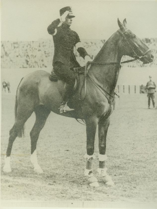 | Nr. inwentarzowy: MŁJ-XVI 1639 / 00 / 051 opis: Holender rtm. Charles Pahud de Mortanges na stojącym koniu Marcroix. Ogłowie wędzidłowe, wytok, napierśnik, ochraniacze na nogach. Duży plac, w głębi trybuny z publicznością za wysokim ogrodzeniem. Przed ogrodzeniem żołnierz.czas powstania - daty graniczne: 1929-01-01 - 1939-08-31osoby: Holender rtm. Charles Pahud de Mortanges - WKKW-ista, olimpijczyk z Paryża 1924 (4 ind., złoty medal zesp.), Akwizgranu 1928 (złoty medal ind. i zesp.), Los Angeles 1932 (złoty medal ind., srebrny zesp.) i Berlina 1936inne nazwy własne: military, Wszechstronny Konkurs Konia Wierzchowegotworzywo: papier fotograficzny, matowytechnika: odbitka żelatynowo-srebrowa z innej odbitkizespół: album Clemensa Nagla Międzynarodowi artyści w jeździe przez przeszkodywymiary (wys. x szer.): 162 x 125 [mm] Koń: 1. Marcroix, wałach - WKKW-ista, złote medale olimpijskie pod Holendrem Charlesem Pahud de Mortanges w 1928 - ind. i zesp., w 1932 - ind., zesp. srebrny