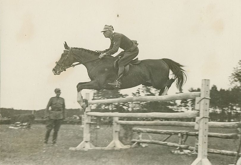 | Nr. inwentarzowy: MŁJ-XVI 1758 / 00 / 051 opis: Tor wyścigów konnych, zawody konne - konkurs ciężki. Rtm. Michał Bohdanowicz s skoku przez triple barre na koniu Talar. Przy przeszkodzie stoi żołnierz, w tle inne przeszkody, drzewa.czas powstania - daty graniczne: 1935-07-11 - 1935-07-11miejsce: Wilno, Pośpieszkaosoby: Rtm. Michał Bohdanowicz 1903-1948 ("Miś", syn Jana Bohdanowicza i Marii z Cywińskich. W latach 1932-1936 w 4 Pułku Ułanów Zaniemeńskich).tworzywo: papier fotograficzny, błyszczącytechnika: odbitka żelatynowo-srebrowa DOP, czarno-białazespół: album rodziny Bohdanowiczówwymiary (wys. x szer.): 85 x 122 [mm] Koń: 1. Talar III, wałach, maść kasztanowata - hod. Bogumiła Hebanowskiego; ur. przed 1928, prywatny koń Michała Bohdanowicza, który startował na nim w konkursach ujeżdżenia, skoków (np. Mitingi Popularne PZJ 1938-39 i WKKW ("Militari"), biegach myśliwskich, skiringu, uczestniczył w ćwiczeniach wojskowych. Dosiadała go też żona Michała - Wanda (m.in. w 1937 r. w Grudziądzu).., na zdjęciu: 1. miejsce