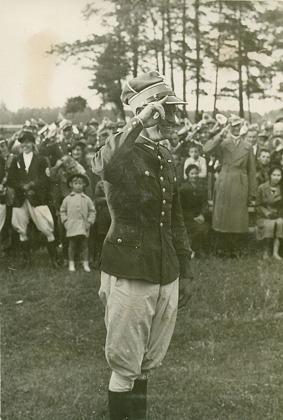| Nr. inwentarzowy: MŁJ-XVI 1758 / 00 / 048 opis: Tor wyścigów konnych, Steeple-chase Wielkich Solecznik. Dekoracja - rtm. Michał Bohdanowicz salutuje podczas odbierania nagrody za wygraną na koniu Ortel. Jeździec w mundurze i jasnych bryczesach. W tle publiczność, drzewa.czas powstania - daty graniczne: 1935-07-11 - 1935-07-11miejsce: Wilno, Pośpieszkaosoby: Rtm. Michał Bohdanowicz 1903-1948 ("Miś", syn Jana Bohdanowicza i Marii z Cywińskich. W latach 1932-1936 w 4 Pułku Ułanów Zaniemeńskich).inne nazwy własne: Wielkie Soleczniki (45 km na południe od Wilna, nad Solczą), pałac i majątek należał do Karola Wagnera.tworzywo: papier fotograficzny, błyszczącytechnika: odbitka żelatynowo-srebrowa DOP, czarno-białazespół: album rodziny Bohdanowiczówwymiary (wys. x szer.): 124 x 85 [mm] Koń: 1. Ortel, wałach, rasa: xx, maść kara, ur. 1929 - po Melk i Kinga, hod. Ludwika Orpiszewskiego, wałach od 1935 r., wł. grona oficerów 1, później 14 p.u., w l. 1932-1935 startował na torach w Łodzi, Warszawie, Zakopanem, Lwowie i Wilnie w gonitwach płaskich, płotowych i przeszkodowych. W WW opisywany jako skarogniady lub ciemnogniady. W 1934 r. m.in. wygrał pod Wł. Korytkowskim (także trener) steeple-chase Orpy i im. Hetmana Stanisława Żółkiewskiego., na zdjęciu: nie ma go na zdjęciu, 1. miejsce