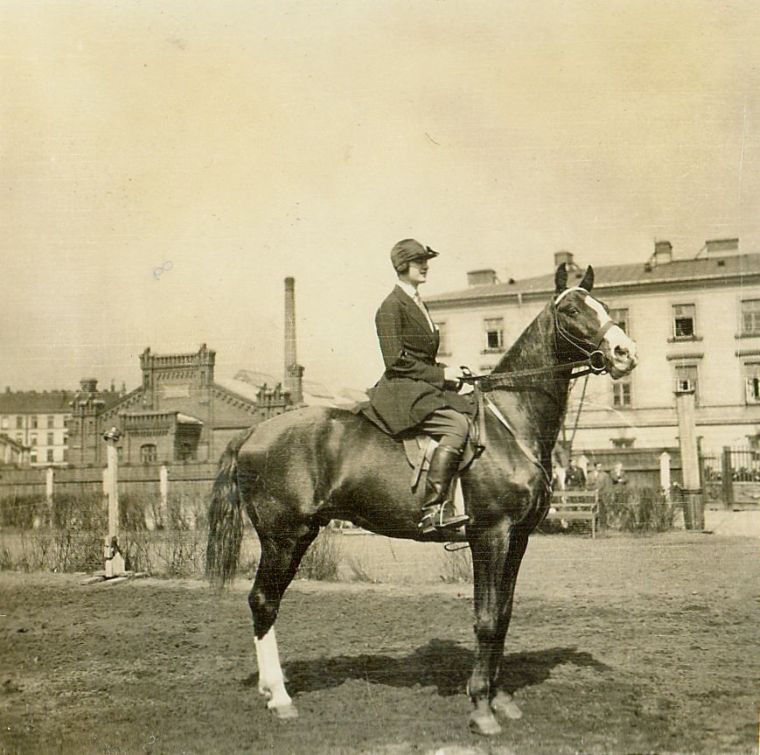 | Nr. inwentarzowy: MŁJ-XVI 1753 / 00 / 124 opis: Janina Słaboszewicz pozuje do zdjęcia na stojącym koniu Mandaryn. Amazonka w ciemnym toczku, fraku, bryczesach i wysokich butach z ostrogami. W tle ogrodzenia, ludzie, budynki.data: kwiecień 1930 r.czas powstania - daty graniczne: 1930-04-01 - 1930-04-30miejsce: Warszawa, ul. Koszykowa 79, Wyższa Szkoła Wojenna, ujeżdżalnia położona w kwartale: Koszykowa – Krzywickiego/Sucha – 6 Sierpnia/Nowowiejska – Topolowa/Al. Niepodległościosoby: Janina Kirn-Słaboszewicz 1910-1975 (Nina, Ninula, po mężu Lipkowska, ziemianka, amazonka startująca w konkursach, uczyła się śpiewu operowego).tworzywo: papier fotograficzny, błyszczącytechnika: odbitka żelatynowo-srebrowa DOP, czarno-białazespół: album rodziny Bohdanowiczówwymiary (wys. x szer.): 61 x 60 [mm] Koń: 1. Mandaryn, wałach, maść kasztanowata, ur. 1920 - hod. NN, wł. Niny Słaboszewicz; oprócz właścicielki dosiadała go Anna Leska