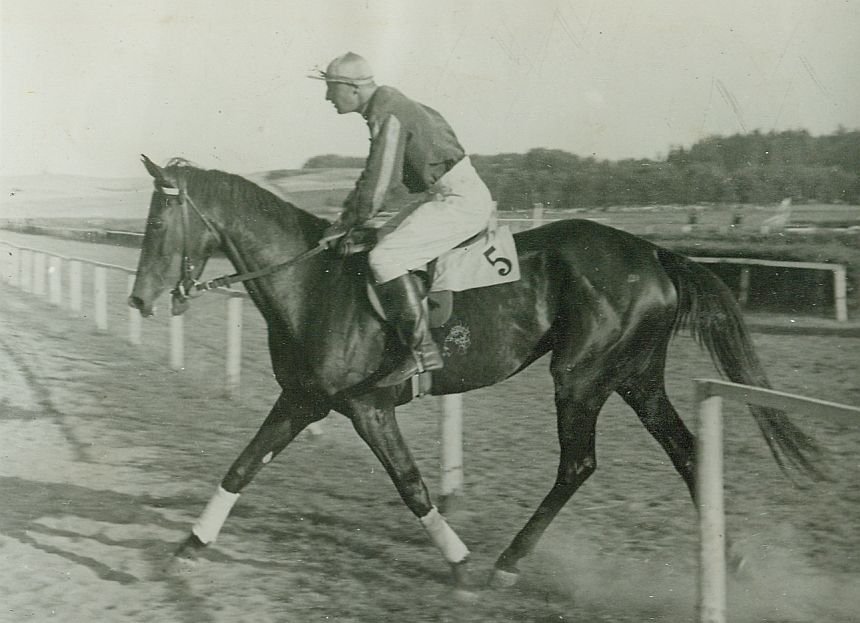 | Nr. inwentarzowy: MŁJ-XVI 1746 / 00 / 108 opis: Tor wyścigów konnych, Steeple-chase im. Towarzystwa Zachęty do Hodowli Koni w Polsce. Po zwycięstwie kłusem do wagi wraca kl. Ixora (na potniku nr 5) pod Michałem Bohdanowiczem. Jeździec w stroju wyścigowym (białe bryczesy, ciemna kurtka, pasy na rękawach i czapka w podobnym kolorze). Koń z zabandażowanymi przednimi nogami w przejściu z bieżni w stronę wagi.czas powstania - daty graniczne: 1936-07-19 - 1936-07-19miejsce: Wilno, Pośpieszka.osoby: Rtm. Michał Bohdanowicz "Miś" (1903-1948), 13 p.u., dowódca 1 szwadronu "Tatarskiego".tworzywo: papier fotograficzny, błyszczącytechnika: odbitka żelatynowo-srebrowa DOP, czarno-białazespół: album rodziny Leskichwymiary (wys. x szer.): 87 x 116 [mm] Koń: 1. Ixora, klacz, rasa: xx - koń, na którym w steeple-chase i gonitwach płotowych startowali M. Bohdanowicz i H. Dobrzański.