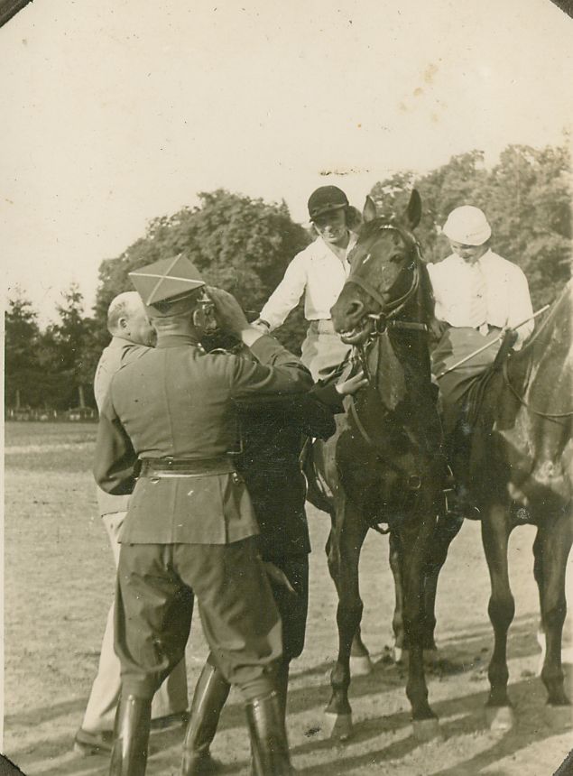 | Nr. inwentarzowy: MŁJ-XVI 1628 / 00 / 020 opis: Rajd konny Hrubieszów-Trzeszczany, kobieta siedząca na koniu (Irena Kostenicz?) przyjmuje gratulacje od trzech mężczyzn: cywila, oficera (salutuje) i trzeciego, słabo widocznego. Dalej Anna Jurkowska. data: powyżej data rajdu, na pewno 2. poł. l. 30. XX w.czas powstania - daty graniczne: 1936-05-15 - 1936-05-31miejsce: Hrubieszów lub okolice Hrubieszowaosoby: Anna Jurkowska (żona por. Leona Jurkowskiego z 2 p.s.k.), Irena Kostenicz(?)inne nazwy własne: Hrubieszowski Klub Jeździecki, 2 Pułk Strzelców Konnych - organizatorzy wydarzeń jeździeckichtworzywo: papier fotograficzny, półbłyszczącytechnika: odbitka żelatynowo-srebrowa DOP, czarno-białaautor: Lebensztein A.zaklad: FOTO-FILM, A. Lebensztein, Hrubieszów, ul. 3 Majazespół: album rodziny Grotthuswymiary (wys. x szer.): 86 x 65 [mm]