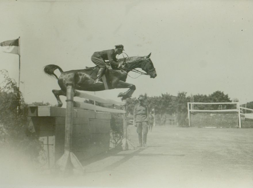 | Nr. inwentarzowy: MŁJ-XVI 1519 / 00 / 021 opis: por. Dąbski-Nerlich 7 DAK – skok przez mur ze stacjonatą; dalej żołnierz, bankiet; dolna część prześwietlonadata: pierwsza połowa lat 30. XX w., ciepła pora rokuczas powstania - daty graniczne: 1930-04-01 - 1935-09-30miejsce: Polska, Grudziądz, C.W.K. [Centrum Wyszkolenia Kawalerii]osoby: Paweł Dąbski-Nerlich (1899-1983). Korpus Kad., Szkoła Ofic. Art. Od 1921 r. 7 DAK. Kampania wrześniowa, Bliski Wschód, kampania włoska. Mistrz Armii 1927, medalista MP w skokach, przygotowania do IO 1932, rekordzista Polski w skoku na wysokość.inne nazwy własne: Paweł Julian Dąbski-Nerlich; Nerlich-Dąbski; Dąmbski Nerlichtworzywo: papier fotograficzny, błyszczącytechnika: odbitka żelatynowo-srebrowa DOP, czarno-białazespół: album rodziny Nieniewskichwymiary (wys. x szer.): 92 x 120 [mm]