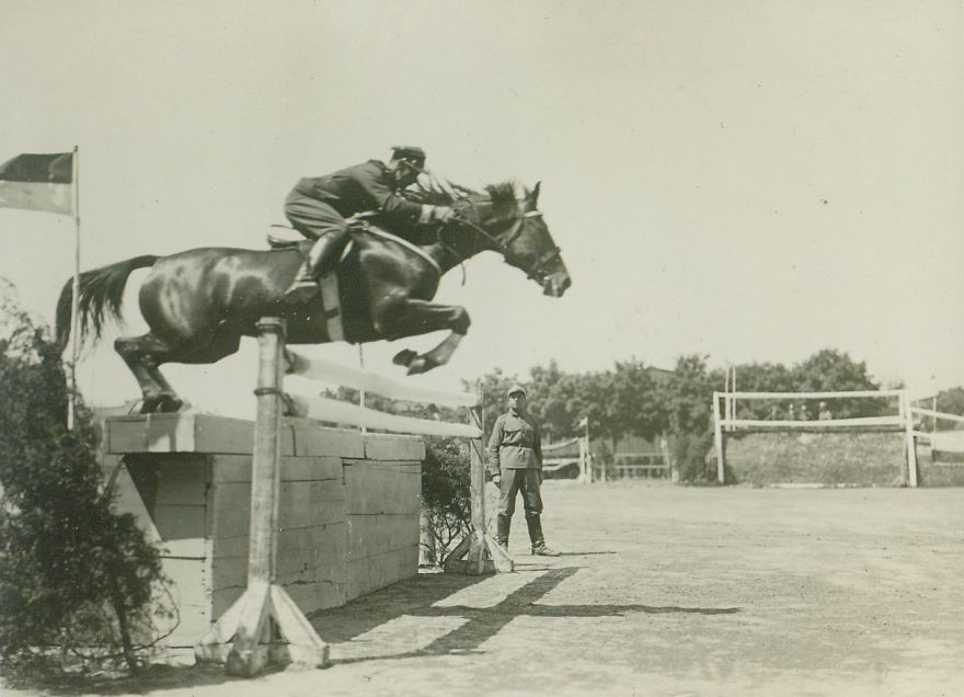 | Nr. inwentarzowy: MŁJ-XVI 1519 / 00 / 020 opis: por. Dąbski-Nerlich 7 DAK – skok przez mur ze stacjonatą; dalej żołnierz, bankietdata: pierwsza połowa lat 30. XX w., ciepła pora rokuczas powstania - daty graniczne: 1930-04-01 - 1935-09-30miejsce: Polska, Grudziądz, C.W.K. [Centrum Wyszkolenia Kawalerii]osoby: Paweł Dąbski-Nerlich (1899-1983). Korpus Kad., Szkoła Ofic. Art. Od 1921 r. 7 DAK. Kampania wrześniowa, Bliski Wschód, kampania włoska. Mistrz Armii 1927, medalista MP w skokach, przygotowania do IO 1932, rekordzista Polski w skoku na wysokość.inne nazwy własne: Paweł Julian Dąbski-Nerlich; Nerlich-Dąbski; Dąmbski Nerlichtworzywo: papier fotograficzny, błyszczącytechnika: odbitka żelatynowo-srebrowa DOP, czarno-białazespół: album rodziny Nieniewskichwymiary (wys. x szer.): 92 x 120 [mm]