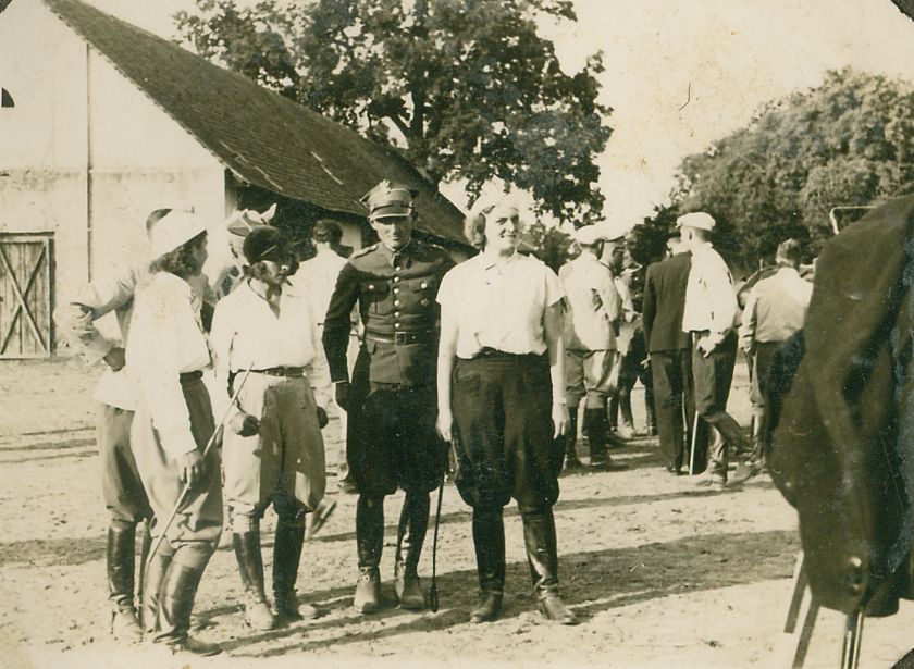 | Nr. inwentarzowy: MŁJ-XVI 1628 / 00 / 017 opis: Rajd konny Hrubieszów-Trzeszczany(?), pięcioro uczestników w letnich strojach jeździeckich pozuje do zdjęcia. Na placu stoją trzy panie, cywil i oficer w mundurze. Na skraju kadru widać osłonięty marynarką aparat fotograficzny na statywie; z tyłu inni ludzie, wiejski budynek, drzewa.data: powyżej data rajdu, na pewno 2. poł. l. 30. XX w.czas powstania - daty graniczne: 1936-05-15 - 1936-05-31miejsce: okolice Hrubieszowainne nazwy własne: Hrubieszowski Klub Jeździecki, 2 Pułk Strzelców Konnych - organizatorzy rajdutworzywo: papier fotograficzny, półbłyszczącytechnika: odbitka żelatynowo-srebrowa DOP, czarno-białaautor: Lebensztein A.zaklad: FOTO-FILM, A. Lebensztein, Hrubieszów, ul. 3 Majazespół: album rodziny Grotthuswymiary (wys. x szer.): 66 x 86 [mm]