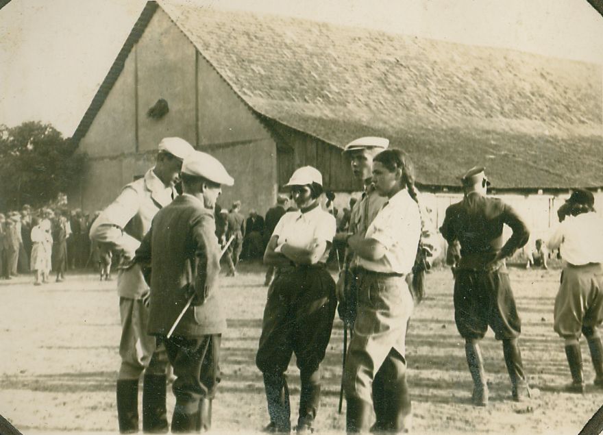 | Nr. inwentarzowy: MŁJ-XVI 1628 / 00 / 015 opis: Rajd konny Hrubieszów-Trzeszczany(?), grupa osób w strojach jeździeckich, wśród nich Barbara Grotthus (z warkoczami). Na placu stoją 3 kobiety, oficer i 3 cywilów. W głębi inne osoby, duży budynek gospodarczy.data: powyżej data rajdu, na pewno 2. poł. l. 30. XX w.czas powstania - daty graniczne: 1936-05-15 - 1936-05-31miejsce: okolice Hrubieszowaosoby: Barbara Grotthus (1917-1999), córka Gustawa i Anny zd. Chłapowskiejinne nazwy własne: Hrubieszowski Klub Jeździecki, 2 Pułk Strzelców Konnych - organizatorzy rajdutworzywo: papier fotograficzny, półbłyszczącytechnika: odbitka żelatynowo-srebrowa DOP, czarno-białazespół: album rodziny Grotthuswymiary (wys. x szer.): 66 x 85 [mm]
