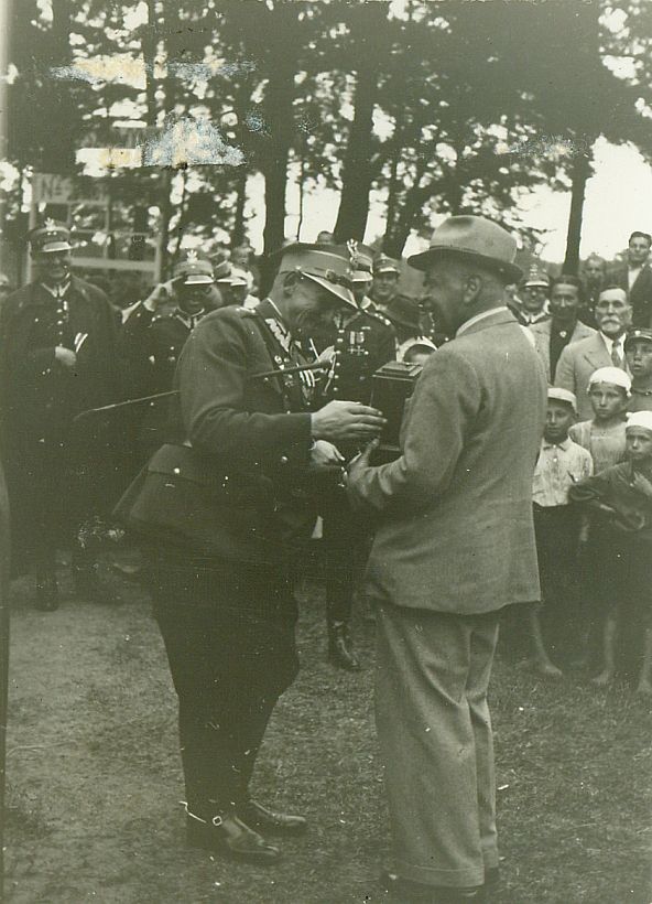 | Nr. inwentarzowy: MŁJ-XVI 1761 / 04 / 033 opis: Tor wyścigów konnych - po wojskowym biegu na przełaj im. Prezesa P.Z.J. płk. Zbigniewa Brochwicz-Lewińskiego. Patron gonitwy wręcza zwycięzcy rtm. Michałowi Bohdanowiczowi nagrodę swojego imienia zdobytą na koniu Żart. Z tyłu publiczność.