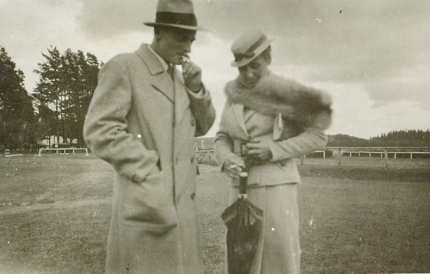 | Nr. inwentarzowy: MŁJ-XVI 1758 / 00 / 078 opis: Tor wyścigów konnych. Por. Roman Pohorecki i Wanda Bohdanowicz palą papierosy. Porucznik w stroju cywilnym (kapelusz, płaszcz). Wanda Bohdanowicz w kapeluszu, jasnym kostiumie, z parasolką. W tle bieżnia toru, drzewa.czas powstania - daty graniczne: 1935-06-30 - 1935-07-21miejsce: Wilno, Pośpieszkaosoby: Por. Roman Józef Pohorecki ur. 1903 (14 p.u., zawodnik klasy międzynarodowej w ostatnim okresie przed II wojną światową); Wanda Bohdanowicz 1908-1991 (z domu Leska, żona rtm. Michała Bohdanowicza, miłośniczka sportów konnych, wyścigów).tworzywo: papier fotograficzny, błyszczącytechnika: odbitka żelatynowo-srebrowa DOP, czarno-białazespół: album rodziny Bohdanowiczówwymiary (wys. x szer.): 54 x 84 [mm]