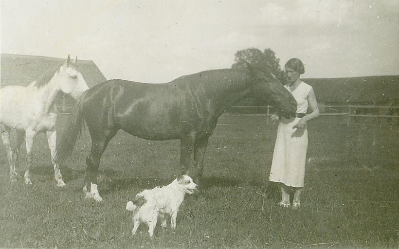 | Nr. inwentarzowy: MŁJ-XVI 1760 / 00 / 046 opis: Helena Bohdanowiczówna w jasnej, letniej sukience stoi na padoku. Przy niej dwa konie, prawdopodobnie klacze. Koń ciemnej maści z odmianą na głowie sięga do ręki kobiety. Siwy koń (klacz Bystra?) stoi trochę dalej. W tle budynki gospodarcze, ogrodzenia, konie na sąsiednim padoku, drzewo. Z przodu pies Kimi (jack russell terrier?).data: czerwiec 1937 r.czas powstania - daty graniczne: 1937-06-01 - 1937-06-30miejsce: Stajki - majątek Bohdanowiczów, obecnie wieś na Białorusi w rejonie wilejskim, obwodu mińskiegoosoby: Helena Bohdanowicz ("Hela", córka Jana Bohdanowicza i Marii "Maryni" zd. Cywińskiej, siostra Krystyny i Michała, współwłaścicielka Stajek).tworzywo: papier fotograficzny, błyszczącytechnika: odbitka żelatynowo-srebrowa DOP, czarno-białazespół: album rodziny Bohdanowiczówwymiary (wys. x szer.): 52 x 83 [mm]