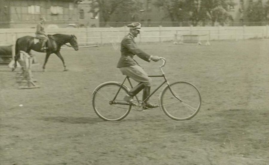 opis: rtm. Seweryn Kulesza 10 p.s.k., jazda na rowerze, w tle jeździec konno