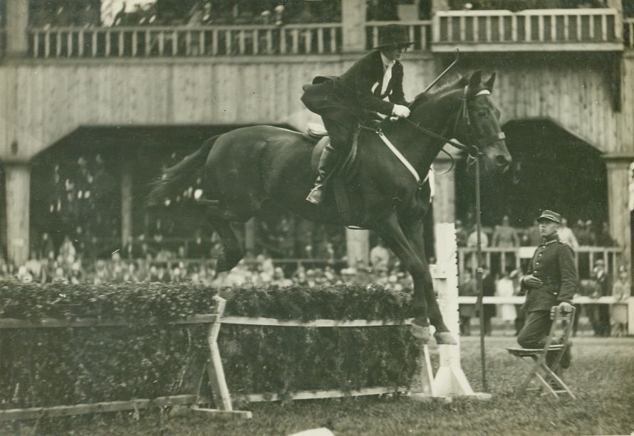 opis: Międzynarodowe Konkursy Hipiczne - amazonka w ciemnym kapeluszu, fraku i bryczesach w skoku przez płotek. Koń ciemnej maści. Pod zdjęciem niewyraźny podpis ołówkiem: Czetwertyńska ? córka