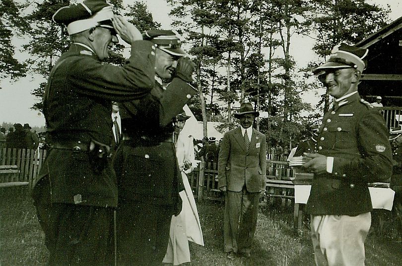 | Nr. inwentarzowy: MŁJ-XVI 1758 / 00 / 026 opis: Tor wyścigów konnych. Rtm. Michał Bohdanowicz (w mundurze i jasnych bryczesach) odbiera nagrody za sukcesy w dniu 7 lipca 1935 r. (na cztery gonitwy - przeszkodowe i biegi na przełaj - wygrał trzy i raz był drugi). Po lewej dwóch salutujących oficerów - z tyłu ppłk Andrzej Kunachowicz. Za nimi w jasnym płaszczu Wanda Bohdanowicz. Z prawej rtm. Michał Bohdanowicz. Na wprost cywil w garniturze i kapeluszu.czas powstania - daty graniczne: 1935-07-07 - 1935-07-07miejsce: Wilno, Pośpieszkaosoby: Ppłk Andrzej Kunachowicz 1895-1980 (dow. 14 p.u. 1932-1936); Wanda Bohdanowicz zd. Leska 1908-1991 (żona M. Bohdanowicza); Rtm. Michał Bohdanowicz 1903-48 (syn Jana Bohdanowicza i Marii z Cywińskich. W latach 1932-36 i przed II wojną w 4 p.u., nazywany "Misiem").tworzywo: papier fotograficzny, błyszczącytechnika: odbitka żelatynowo-srebrowa DOP, czarno-białazespół: album rodziny Bohdanowiczówwymiary (wys. x szer.): 55 x 80 [mm]