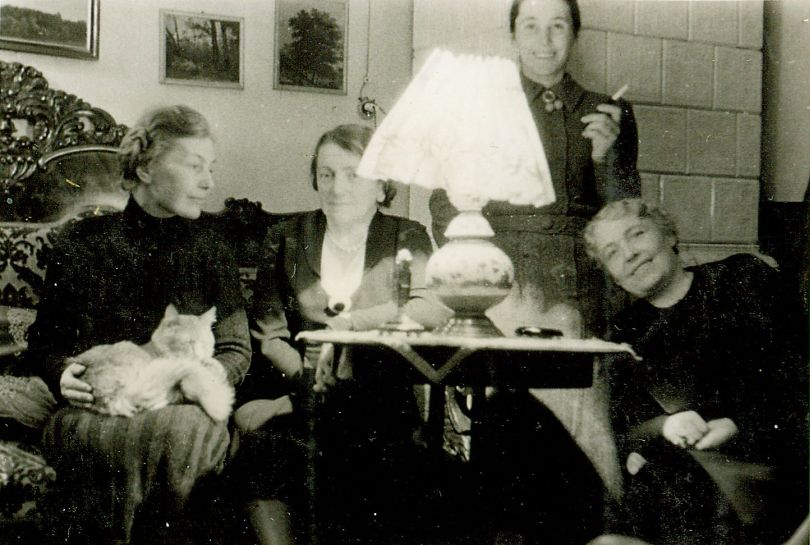| Nr. inwentarzowy: MŁJ-XVI 1759 / 00 / 084 opis: W warszawskim mieszkaniu przy stoliku kawowym kobiety ze skoligaconych rodzin Kleebergów i Leskich od lewej: Maria Leska (siedzi w ciemnej bluzce i pasiastej spódnicy z kotem na kolanach), Sabina Kleeberg (siedzi w ciemnym kostiumie), Wanda Bohdanowiczowa (stoi z papierosem), Halina Kleebergowa (siedzi w ciemnej sukni). W tle m.in. piec kaflowy, rzeźbione wezgłowie, obrazy na ścianie. Na stoliku m.in. lampa elektryczna.czas powstania - daty graniczne: 1937-03-04 - 1937-03-04miejsce: Warszawaosoby: Maria Leska 1886-1949 (z domu Przejmo-Olszyńska, siostra Haliny Kleeberg, żona Juliusza Leskiego, matka Wandy, Anny i Kazimierza Leskich); Sabina Kleeberg; Wanda Bohdanowicz 1908-1991 (z domu Leska, córka Juliusza Leskiego i Marii zd. Olszyńskiej, żona Michała Bohdanowicza); Halina Kleebergowa ("Hela", z domu Przejmo-Olszyńska, żona Juliusza Kleeberga, siostra Marii Leskiej).tworzywo: papier fotograficzny, błyszczącytechnika: odbitka żelatynowo-srebrowa DOP, czarno-białazespół: album rodziny Bohdanowiczówwymiary (wys. x szer.): 57 x 83 [mm]