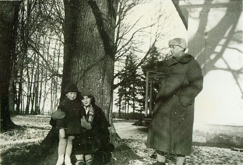 | Nr. inwentarzowy: MŁJ-XVI 1759 / 00 / 080 opis: W parku obok dworu Bohdanowiczów do zdjęcia pozuje rodzina. Pod drzewem kuca Róża Bohdanowicz (widać czapkę, szalik, ciemny płaszcz i ciepłe buty). Obok matki stoi Andrzej Bohdanowicz (chłopczyk w ciemnej czapce i płaszczyku oraz jasnych butach i rajtuzach). Z prawej stoi mąż i ojciec (w czapce z barankiem i ciepłym płaszczu). Widać skraj domu z fragmentem tarasu.data: grudzień 1936 r. - styczeń 1937 r.czas powstania - daty graniczne: 1936-12-01 - 1937-01-31miejsce: Stajki - majątek Bohdanowiczów, obecnie wieś na Białorusi w rejonie wilejskim, obwodu mińskiegoosoby: Róża Maria Bohdanowicz ("Rozmaryna", "Rozmaryńcia", z domu Jordan, żona Karola Bohdanowicza, matka Andrzeja Bohdanowicza, chorowała na płuca, zmarła w 1940 lub 1941 r.); Andrzej Bohdanowicz ur. 1932 r. (syn Karola Bohdanowicza i Róży Marii z Jordanów); Karol Bohdanowicz 1893-1956, mąż Róży Marii z Jordanów, ojciec Andrzeja Bohdanowicza).tworzywo: papier fotograficzny, błyszczącytechnika: odbitka żelatynowo-srebrowa DOP, czarno-białazespół: album rodziny Bohdanowiczówwymiary (wys. x szer.): 56 x 80 [mm]