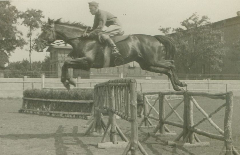 opis: kpt. Winchestern z USA, skok przez niski szeroki double-barre z płotków , III Wyższy Kurs Instruktorów Jazdy Konnej [trwał od 15.10.1932]