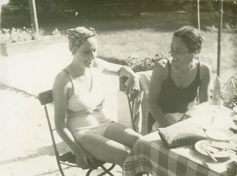 | Nr. inwentarzowy: MŁJ-XVI 1760 / 00 / 015 opis: Po obiedzie na terenie kąpieliska nad Rudnikiem. Przy stole, na składanych krzesłach siedzą Janina Szawłowska (w chustce i jasnym kostiumie kąpielowym) i Wanda Bohdanowiczowa (w ciemnym kostiumie kąpielowym). W tle trawnik, donice z kwiatami.data: czerwiec 1937 r.czas powstania - daty graniczne: 1937-06-01 - 1937-06-30miejsce: Grudziądz, plaża nad jeziorem Rudnikosoby: Janina Szawłowska ur. 1910 r. ("Jańcia", żona rtm. Edwarda Szawłowskiego, który zginął w kampanii wrześniowej, w 1940 r. wyszła za mąż za Antoniego Żelewskiego); Wanda Bohdanowicz 1908-1991 (z domu Leska, żona Michała Bohdanowicza).tworzywo: papier fotograficzny, półbłyszczącytechnika: odbitka żelatynowo-srebrowa DOP, czarno-białazespół: album rodziny Bohdanowiczówwymiary (wys. x szer.): 60 x 79 [mm]