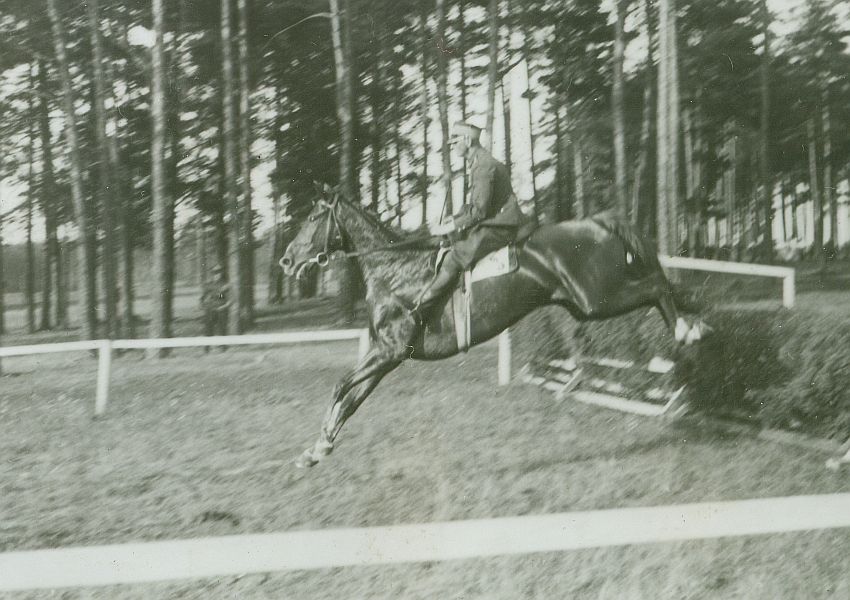 | Nr. inwentarzowy: MŁJ-XVI 1761 / 03 / 021 opis: Okolice toru wyścigów konnych - biegi na przełaj odbywały się częściowo poza torem. Wojskowy bieg na przełaj im. Szefa Remontu Koni M.S.Wojsk. gen. bryg. Stefana Dembińskiego. Rtm. Michał Bohdanowicz na koniu Żart ląduje po skoku przez hyrdę. Kolejność na celowniku: 1. Amper, 2. Żart, 3. Emir, 0 Komedia - upadła na skoku trybunowym i nie ukończyła.czas powstania - daty graniczne: 1939-06-25 - 1939-06-25miejsce: Wilno, Pośpieszkaosoby: Rtm. Michał Bohdanowicz 1903-48 (syn Jana Bohdanowicza i Marii z Cywińskich, brat Heleny i Krystyny, mąż Wandy z domu Leskiej. W latach 1932-36 i przed II wojną w 4 Pułku Ułanów Zaniemeńskich, od 1936 w 13 Pułku Ułanów Wileńskich; nazywany "Misiem". Podczas kampanii wrześniowej trafił do niewoli, zmarł niedługo po powrocie z oflagu).tworzywo: papier fotograficzny, błyszczącytechnika: odbitka żelatynowo-srebrowa DOP, czarno-białazespół: album rodziny Bohdanowiczówwymiary (wys. x szer.): 61 x 82 [mm] Konie: 1. Żart IV, maść kasztanowata - Manton xx - Żurna lub Żurka; hod. hr. Korzbok-Łącki, wł. M.S.Wojsk., w 1938 r. startował w biegach na przełaj w Poznaniu pod A. Szamotą; w 1939 r. startował w biegach na przełaj w Wilnie pod M. Bohdanowiczem i St. Chrząszczem, na zdjęciu: 2. miejsce 2. Gracz (Amper) - hod. St. Grzybowski, wł. M.S.Wojsk., w 1938 r. startował w biegach na przełaj w Poznaniu pod por. Wojnarowskim; w 1939 r. startował w biegach na przełaj w Wilnie, na zdjęciu: nie ma go na zdjęciu, 1. miejsce 3. Emir (Takt), wałach, rasa: półkrwi, maść gniada - po Tarczyn xx i Plotka, hod. G. Kiwerskiego, koń służbowy rtm. Cichowskiego, trener ppor. Kisielewski; w 1938 r. stratował w biegach na przełaj w Poznaniu pod A. Szamotą; w 1939 r. stratował w Wilnie w biegach na przełaj i gonitwie z przeszkodami (j. A. Szamota), na zdjęciu: nie ma go na zdjęciu, 3. miejsce 4. Komedia, klacz - koń, który w 1939 r. startował w Wilnie w biegu na przełaj, na zdjęciu: nie ma jej na zdjęciu, upadła, nie ukończyła