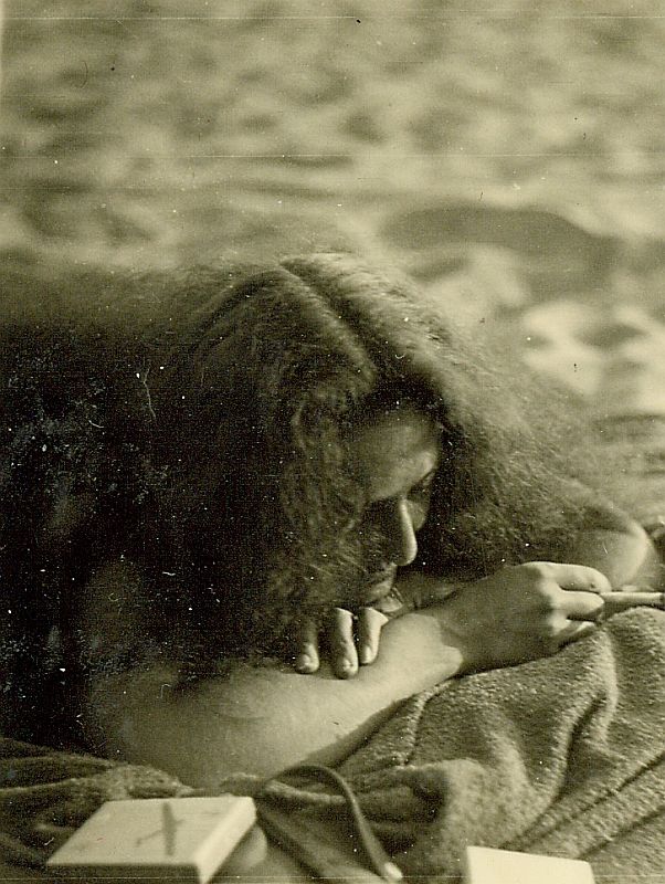 | Nr. inwentarzowy: MŁJ-XVI 1760 / 00 / 028 opis: Anna Leska podczas kursu motorowego w Toruniu. Kobieta z rozpuszczonymi gęstymi, kręconymi włosami leży na piasku, na kocu i pali papierosa. Obok leży pudełko z sylwetką szybowca - papierośnica?data: czerwiec 1937 r.czas powstania - daty graniczne: 1937-06-01 - 1937-06-30miejsce: Toruńosoby: Anna Leska 1910-1998 ("Anka", córka Juliusza Leskiego i Marii zd. Olszyńskiej, siostra Wandy i Kazimierza; członkini K.S.R.W.; później Leska-Daab, Ukończyła kurs szybowcowy, a następnie szkolenie motorowe (samoloty z silnikiem) w 4 Pułku Lotniczym w Toruniu. W Toruniu przeszła też szkolenie na pilota balonowego. Podczas II wojny światowej pilot w Wielkiej Brytanii w Lotniczej Służbie Transportowej (ATA).tworzywo: papier fotograficzny, błyszczącytechnika: odbitka żelatynowo-srebrowa DOP, tonowana?zespół: album rodziny Bohdanowiczówwymiary (wys. x szer.): 61 x 48 [mm]