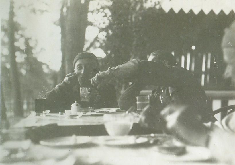 | Nr. inwentarzowy: MŁJ-XVI 1757 / 00 / 019 opis: Posiłek dwóch poruczników - jeźdźców wyścigowych. Przy stole siedzą por. Stefan Gromnicki (z lewej) i por. Michał Bohdanowicz. data: czerwiec-lipiec 1934 r.czas powstania - daty graniczne: 1934-06-01 - 1934-07-31miejsce: Wilno, Pośpieszkaosoby: Por. Michał Bohdanowicz 1903-48 ("Miś", syn Jana i Marii z Cywińskich. W latach 1932-36 i przed II wojną w 4 p.u., mąż Wandy zd. Leskiej); por. Stefan Gromnicki 1900-1941 Auschwitz-Birkenau (oficer, jeździec konkursowy i wyścigowy, służył w różnych jednostkach, w 1934 r. przeszedł w stan spoczynku i zajął się hodowlą w stadninach: E. Kurnatowskiego w Łochowie i S. Czetwertyńskiego w Suchowoli).tworzywo: papier fotograficzny, błyszczącytechnika: odbitka żelatynowo-srebrowa DOP, czarno-białazespół: album rodziny Bohdanowiczówwymiary (wys. x szer.): 81 x 111 [mm]
