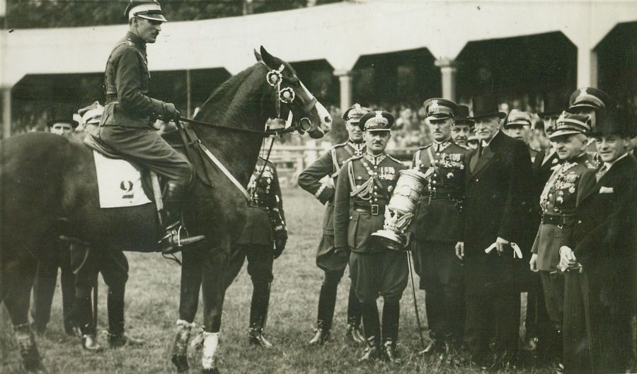 opis: Rtm. Kazimierz Szosland 2 p.u. na koniu Alli odbiera nagrody: puchar za 1 miejsce w Pucharze Narodów i nagrodę Prezydenta RP dla najlepszego jeźdźca. Stoją m.in.: prezydent Ignacy Mościcki; szef Protokołu Dypl. MSZ Karol Romer (1. z prawej), płk Jan Maciej Bold (2. z prawej), szef Departamentu Artylerii M.S. Wojsk., mjr Kazimierz Jurgielewicz (3. z lewej), szef Gab. Wojskowego Prezydenta RP płk Jan Głogowski (2. z prawej, z pucharem), szef Kancelarii Cywilnej Prezydenta RP Bronisław Hełczyński (z tyłu).