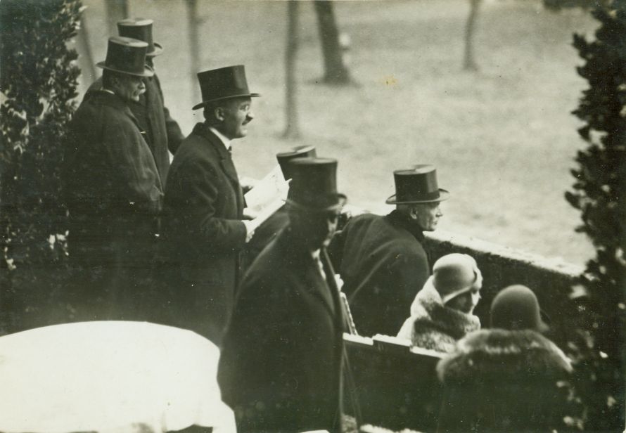 opis: Międzynarodowe Konkursy Hipiczne - loża honorowa, sześciu dżentelmenów (w tym prezydent Ignacy Mościcki) i dwie panie
