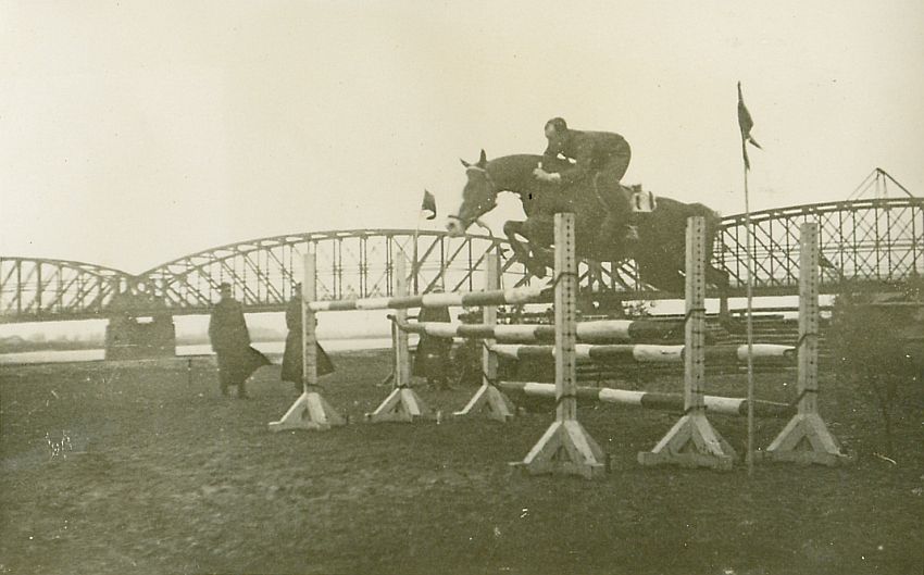 | Nr. inwentarzowy: MŁJ-XVI 1760 / 00 / 012 opis: Konkursy Pomorskiego Towarzystwa Zachęty do Hodowli Koni. Por. Janusz Komorowski skacze na koniu Zbój IV przez przeszkodę - triple-barre. Jeździec w mundurze, bez czapki, obok kilku wojskowych, w tle most na Wiśle.czas powstania - daty graniczne: 1937-04-22 - 1937-04-24miejsce: Grudziądzosoby: Por. Janusz Komorowski 1905-1993 (1 p.u., wybitny jeździec - skoczek, olimpijczyk z 1936 r., trener, w kampanii wrześniowej trafił do niewoli, walczył w armii gen. Andersa, wieloletnia emigracja w Argentynie).tworzywo: papier fotograficzny, błyszczącytechnika: odbitka żelatynowo-srebrowa DOP, tonowana?zespół: album rodziny Bohdanowiczówwymiary (wys. x szer.): 56 x 86 [mm] Koń: 1. Zbój IV, wałach, maść kasztanowata, ur. 1928 - hod. hr. Witold Łoś, Piotrowice, wł. M.S.Wojsk., startował pod J. Komorowskim w 2. poł. l. 30. w konkursach krajowych i międzynarodowych (m.in.: Warszawa, Grudziądz, Nicea, Insterburg)