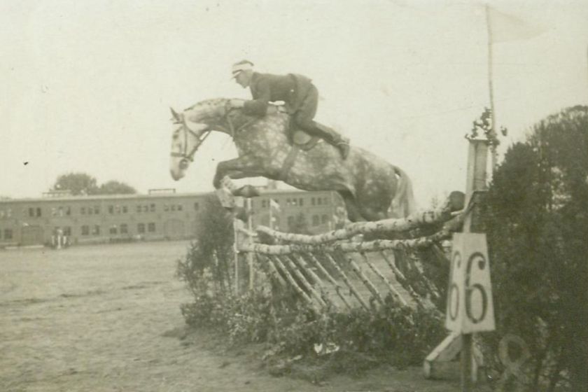 opis: por. Tadeusz Gierwatowski 6 p.s.k., skok przez brzozowy płotek nr 6; zarzucona łydka zakrywa numer na potniku