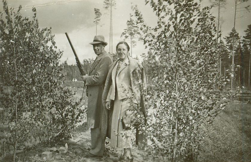 | Nr. inwentarzowy: MŁJ-XVI 1758 / 00 / 086 opis: Polowanie na kaczki. Na skraju łąki, przy młodych brzózkach stoją: por. Antoni Żelewski (w jasnym garniturze, kapeluszu i płaszczu) z bronią i Wanda Bohdanowicz (w jasnym żakiecie i płaszczu, z torebką).czas powstania - daty graniczne: 1935-07-16 - 1935-07-16miejsce: Wiazyń (wieś w powiecie wilejskim, obecnie na Białorusi), ok. 30 km od Stajek.osoby: Por. Antoni Żelewski 1905-1994 (jeździec wyścigowy, jeździec sportowy klasy międzynarodowej, instruktor); Wanda Bohdanowicz 1908-1991 (z domu Leska, żona rtm. Michała Bohdanowicza).tworzywo: papier fotograficzny, błyszczącytechnika: odbitka żelatynowo-srebrowa DOP, czarno-białazespół: album rodziny Bohdanowiczówwymiary (wys. x szer.): 54 x 84 [mm]