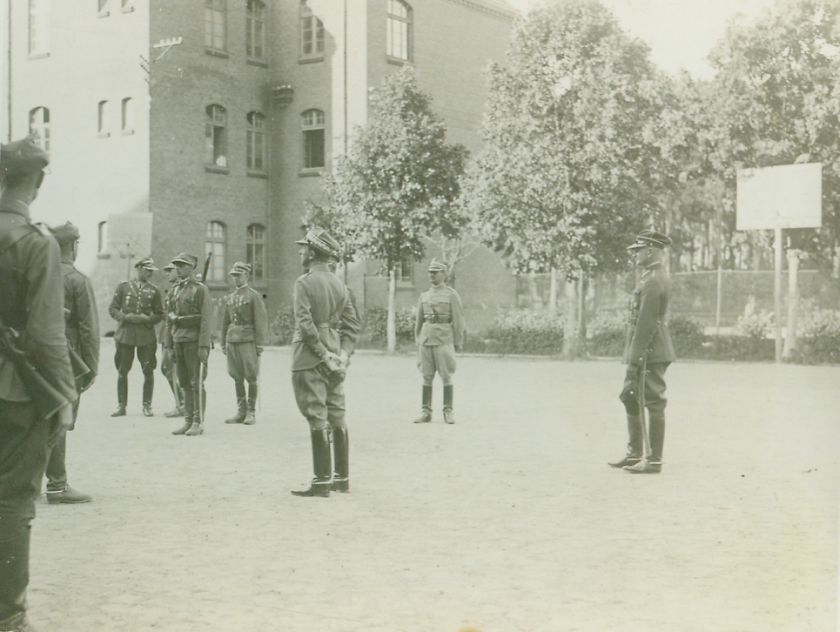 opis: plac, budynki, lustracja oddziału pieszo; ujęcie od strony oddziału (widać tylko pierwszego w szeregu), kilku oficerów, tablica do koszykówki