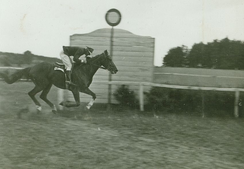| Nr. inwentarzowy: MŁJ-XVI 1761 / 03 / 023 opis: Tor wyścigów konnych - bieg na przełaj. Rtm. Michał Bohdanowicz (mundur, jasne bryczesy) na koniu Żart przejeżdża przez celownik.czas powstania - daty graniczne: 1939-06-18 - 1939-07-02miejsce: Wilno, Pośpieszkaosoby: Rtm. Michał Bohdanowicz 1903-48 (syn Jana Bohdanowicza i Marii z Cywińskich, brat Heleny i Krystyny, mąż Wandy z domu Leskiej. W latach 1932-36 i przed II wojną w 4 Pułku Ułanów Zaniemeńskich, od 1936 w 13 Pułku Ułanów Wileńskich; nazywany "Misiem". Podczas kampanii wrześniowej trafił do niewoli, zmarł niedługo po powrocie z oflagu).tworzywo: papier fotograficzny, błyszczącytechnika: odbitka żelatynowo-srebrowa DOP, czarno-białazespół: album rodziny Bohdanowiczówwymiary (wys. x szer.): 61 x 85 [mm] Koń: 1. Żart IV, maść kasztanowata - Manton xx - Żurna lub Żurka; hod. hr. Korzbok-Łącki, wł. M.S.Wojsk., w 1938 r. startował w biegach na przełaj w Poznaniu pod A. Szamotą; w 1939 r. startował w biegach na przełaj w Wilnie pod M. Bohdanowiczem i St. Chrząszczem