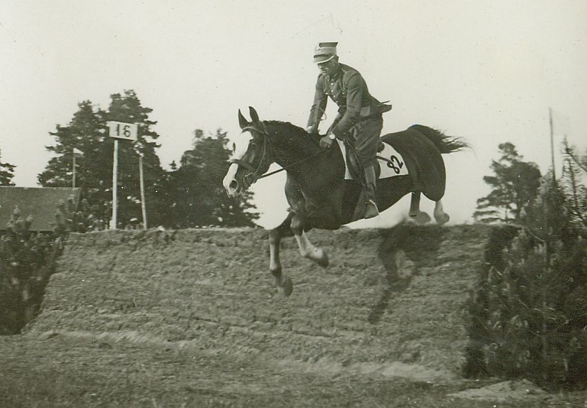 | Nr. inwentarzowy: MŁJ-XVI 1761 / 01 / 001 opis: „II Popularny Meeting P.Z.J.” na torze wyścigowym Pośpieszka pod Wilnem. Rtm. Michał Bohdanowicz na koniu Talar III skacze przez przeszkodę nr 16 - wał. Jeździec w mundurze, na potniku nr 82.data: okres mitingu PZJ w Wilnie - 8, 10, 11 czerwca 1939 r.czas powstania - daty graniczne: 1939-06-08 - 1939-06-11miejsce: Wilno, Pośpieszkaosoby: Rtm. Michał Bohdanowicz 1903-1948 (syn Jana Bohdanowicza i Marii z Cywińskich. W latach 1932-1936 i przed II wojną w 4 Pułku Ułanów Zaniemeńskich, od 1936 w 13 Pułku Ułanów Wileńskich; nazywany "Misiem").inne nazwy własne: PZJ, Polski Związek Jeździecki; mitingtworzywo: papier fotograficzny, błyszczącytechnika: odbitka żelatynowo-srebrowa DOP, czarno-białazespół: album rodziny Bohdanowiczówwymiary (wys. x szer.): 56 x 86 [mm] Koń: 1. Talar III, wałach, maść kasztanowata - hod. Bogumiła Hebanowskiego; ur. przed 1928, prywatny koń Michała Bohdanowicza, który startował na nim w konkursach ujeżdżenia, skoków (np. Mitingi Popularne PZJ 1938-39 i WKKW ("Militari"), biegach myśliwskich, skiringu, uczestniczył w ćwiczeniach wojskowych. Dosiadała go też żona Michała - Wanda (m.in. w 1937 r. w Grudziądzu)..