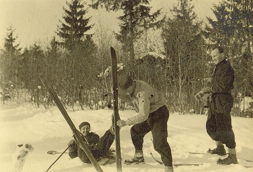 | Nr. inwentarzowy: MŁJ-XVI 1759 / 00 / 046 opis: Na nartach. Od lewej: Wanda Bohdanowicz (leży na śniegu z nartami ustawionymi pionowo, ciemny strój, beret), rtm. Michał Bohdanowicz (stoi bez nart w czapce, bluzie, spodniach i butach narciarskich, smaruje żonie ślizg narty), rtm. Włodzimierz Prosiński (ciemna bluza, ciemne spodnie i buty narciarskie, na wysokości brzucha aparat fotograficzny?). Dużo śniegu, w tle drzewa, z lewej pies Kimi (jack russell terrier?).data: luty 1936 r.czas powstania - daty graniczne: 1936-02-01 - 1936-02-29miejsce: Nowo-Wilejka, Nowa Wilejka, obecnie Litwaosoby: Rtm. Michał Bohdanowicz 1903-48 (syn Jana Bohdanowicza i Marii z Cywińskich. W latach 1932-36 i przed II wojną w 4 Pułku Ułanów Zaniemeńskich, od 1936 w 13 Pułku Ułanów Wileńskich, miłośnik sportu, zwłaszcza wyścigów płotowych, przeszkodowych i biegów na przełaj, mąż Wandy); Wanda Bohdanowicz 1908-1991 (z domu Leska, miłośniczka sportów, zwłaszcza konnych, wyścigów, żona rtm. Michała Bohdanowicza); rtm. Włodzimierz Prosiński ur. 1894 (13 p.u., miłośnik sportu, zwłaszcza konnego: skoki, Militari, wyścigi).tworzywo: papier fotograficzny, matowytechnika: odbitka żelatynowo-srebrowa DOP, czarno-białazespół: album rodziny Bohdanowiczówwymiary (wys. x szer.): 56 x 80 [mm]
