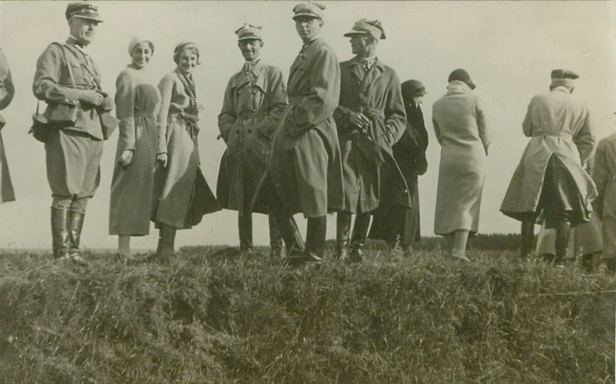 opis: grupa osób stoi na rozległej łące: 4 panie, 5 wojskowych