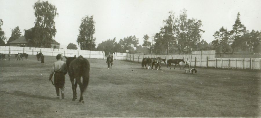 Nr. inwentarzowy: MŁJ-XVI 1757 / 00 / 021 opis: Około 10 mężczyzn i koni, prawdopodobnie po treningu wyścigowym. Na ogrodzonym placu konie stoją lub są oprowadzane w ręku, w stępie.data: czerwiec-lipiec 1934 r.czas powstania - daty graniczne: 1934-06-01 - 1934-07-31miejsce: Wilno, Pośpieszkatworzywo:papier fotograficzny, błyszczącytechnika:odbitka żelatynowo-srebrowa DOP, czarno-białazespół:album rodziny Bohdanowiczówwymiary (wys. x szer.): 52 x 111 [mm]