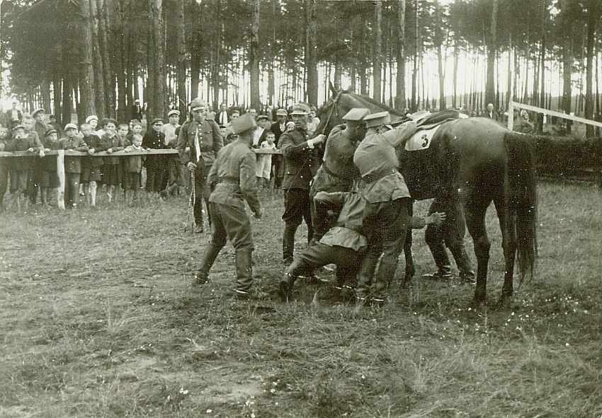 | Nr. inwentarzowy: MŁJ-XVI 1761 / 01 / 005 opis: Wojskowa gonitwa z przeszkodami Horodźca dla pełnoletnich koni (III grupy), dystans 3200 m. Grupa żołnierzy pomaga siodłać kl. Festynę (nr 3 na potniku), która wraz z rtm. Michałem Bohdanowiczem upadła na finiszowym płocie. Para ukończyła gonitwę, a 25 czerwca zajęli 2. miejsce w podobnym wyścigu.czas powstania - daty graniczne: 1939-06-18 - 1939-06-18miejsce: Wilno, Pośpieszkaosoby: Rtm. Michał Bohdanowicz 1903-48 (syn Jana Bohdanowicza i Marii z Cywińskich, brat Heleny i Krystyny, mąż Wandy z domu Leskiej. W latach 1932-36 i przed II wojną w 4 Pułku Ułanów Zaniemeńskich, od 1936 w 13 Pułku Ułanów Wileńskich; nazywany "Misiem". Podczas kampanii wrześniowej trafił do niewoli, zmarł niedługo po powrocie z oflagu).inne nazwy własne: Horodziec (Łużki) - majątek z zespołem dworsko-parkowym, do 1939 należał do Plater-Zyberków.tworzywo: papier fotograficzny, błyszczącytechnika: odbitka żelatynowo-srebrowa DOP, czarno-białazespół: album rodziny Bohdanowiczówwymiary (wys. x szer.): 60 x 85 [mm] Koń: 1. Decobra (Festyna), klacz, maść ciemnogniada, ur. 1933 - po Starting Gate i Dzida, hod. Cecylii Dzierzbickiej, wł. rtm. Ugrechelidze; w 1939 r. stratowała we Lwowie oraz w Wilnie (pod M. Bohdanowiczem w gonitwach przeszkodowych biegach na przełaj), na zdjęciu: 6 lat