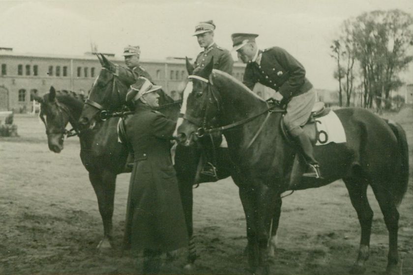 opis: Konkursy hipiczne. 4 oficerów: 3 konno, jeden wręczający nagrodę lub gratulujący por. Tadeuszowi Sokołowskiemu z 1 p.szw. po konkursie ujeżdżenia.