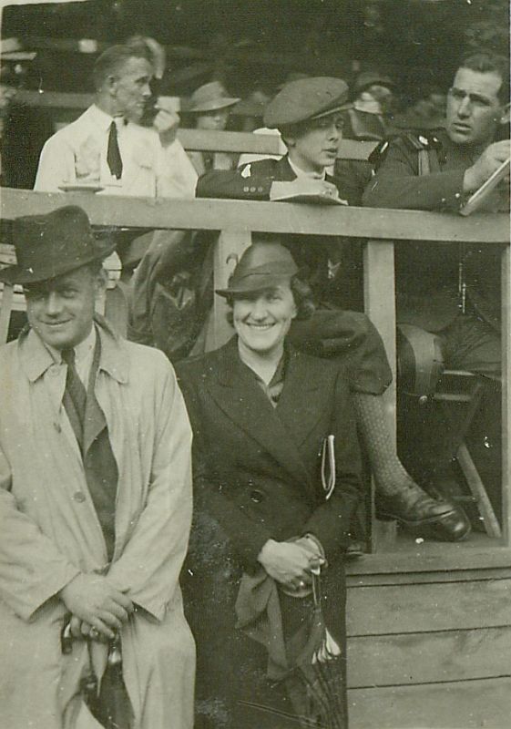 | Nr. inwentarzowy: MŁJ-XVI 1760 / 00 / 052 opis: Konkursy skoków przez przeszkody. Przed trybuną stoją Andrzej Daszewski (kapelusz, jasny płaszcz, garnitur, złożony parasol) i jego żona Anna Daszewska (ciemny kapelusik i płaszcz, złożona parasolka, torebka i prawdopodobnie program). Z tyłu inni kibice.data: okres trwania konkursów w Łazienkach, w albumie: czerwiec 1937 r.czas powstania - daty graniczne: 1937-05-27 - 1937-06-07miejsce: Warszawa, hipodrom w Łazienkachosoby: Anna Izasłąwa Daszewska 1906-1955 ("Hanka", z domu Sroczyńska, członkini KSRW, uczestniczka wielu konkursów hipicznych); Andrzeja Daszewski 1899-1944. tworzywo: papier fotograficzny, błyszczącytechnika: odbitka żelatynowo-srebrowa DOP, czarno-białazespół: album rodziny Bohdanowiczówwymiary (wys. x szer.): 55 x 40 [mm]