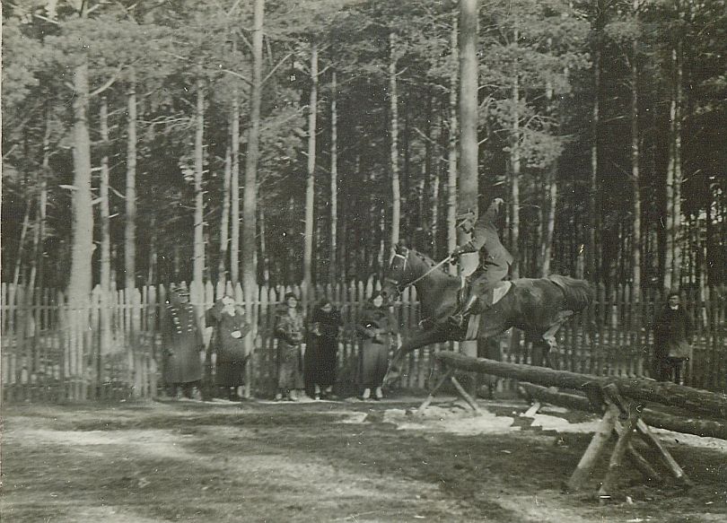 | Nr. inwentarzowy: MŁJ-XVI 1759 / 00 / 026 opis: Bieg św. Huberta w 4 Pułku Ułanów Zaniemeńskich. Przez przeszkodę "domowej roboty" (drągi na krzyżakach) skacze na kasztanowatym koniu rtm. Michał Bohdanowicz. Koń w ogłowiu z nachrapnikiem polskim i siodle sportowym. Jeździec w charakterystycznym dla siebie stylu (prosta, wyciągnięta do przodu noga, w uniesionej, prawej ręce palcat. Z tyłu drewniany płot przy którym stoi oficer, kilka kobiet i cywil. W tle sosnowy las.czas powstania - daty graniczne: 1935-11-03 - 1935-11-03miejsce: Wilnoosoby: Rtm. Michał Bohdanowicz 1903-48 (syn Jana Bohdanowicza i Marii z Cywińskich. W latach 1932-36 i przed II wojną w 4 Pułku Ułanów Zaniemeńskich, od 1936 w 13 Pułku Ułanów Wileńskich; nazywany "Misiem".tworzywo: papier fotograficzny, błyszczącytechnika: odbitka żelatynowo-srebrowa DOP, czarno-białazespół: album rodziny Bohdanowiczówwymiary (wys. x szer.): 59 x 80 [mm]