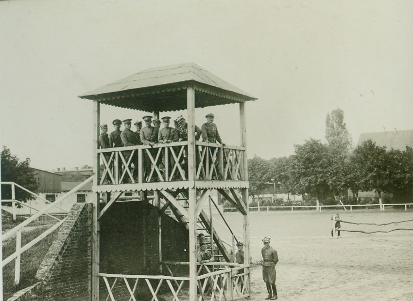 opis: plac - ujeżdżalnia w C.W.K.; drewniana wieżyczka przy włoskiej górce, na niej 10 oficerów; na dole jeszcze kilku żołnierzy, widać stacjonatę z krzywych drągów