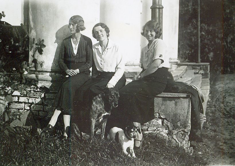 | Nr. inwentarzowy: MŁJ-XVI 1758 / 00 / 077 opis: Na schodach dworu, pod kolumnadą siedzą od lewej: Helena Bohdanowicz, Maryńcia (Maria?) Bohdanowicz i Krystyna Bohdanowicz. Obok Marii siedzi większy pies o umaszczeniu moręgowatym, pod nogami Krystyny leży pies Bobik (jack russell terier?). Schody i ich boczne części zniszczone.data: lato 1935 r.czas powstania - daty graniczne: 1935-06-01 - 1935-09-30miejsce: Jeden z majątków Bohdanowiczów?osoby: Córki Jana Bohdanowicza i Maryni zd. Cywińskiej, siostry Michała Bohdanowicza: Helena Bohdanowicz "Hela" ur. 1899 r. i Krystyna Bohdanowicz "Krysia"; prawdopodobnie Maria Bohdanowiczówna 1900-1942 ("Maryńcia", córka Józefa i Izy Raue, ostatnia właścicielka majątku Maćkowce, rozstrzelana przez Gestapo za współpracę z polskim podziemiem).tworzywo: papier fotograficzny, błyszczącytechnika: odbitka żelatynowo-srebrowa DOP, czarno-białazespół: album rodziny Bohdanowiczówwymiary (wys. x szer.): 57 x 80 [mm]