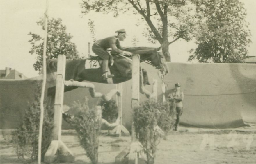 opis: por. Henryk Gąsecki 13 D.A.K., skok przez okser z malowniczo wygiętych drągów, na potniku nr 12