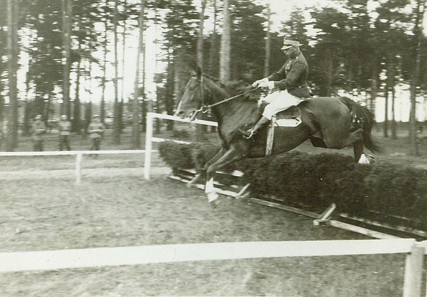 | Nr. inwentarzowy: MŁJ-XVI 1761 / 02 / 012 opis: Tor wyścigów konnych - wojskowy bieg na przełaj Mejszagoły (Mejszagoła - miasteczko 30 km na północ od Wilna), łączący sport i wyścigi, prowadzący częściowo poza torem, dyst. 5000 m. Rtm. Michał Bohdanowicz w skoku przez płot - hyrdę na koniu Żart - zwycięzcy. Kolejne miejsca zajęli: drugie Buńczuk – mjr Władysław Bobiński, Trzecie Eks – ppor. Stanisław Chrząszcz. W tle drzewa, kilku wojskowych.czas powstania - daty graniczne: 1939-06-22 - 1939-06-22miejsce: Wilno, Pośpieszkaosoby: Rtm. Michał Bohdanowicz 1903-48 (syn Jana Bohdanowicza i Marii z Cywińskich. W latach 1932-36 i przed II wojną w 4 Pułku Ułanów Zaniemeńskich, od 1936 w 13 Pułku Ułanów Wileńskich; nazywany "Misiem"); niewidoczni: Władysław Bobiński 1901-1975 (jeździec klasy krajowej; 15 p.u., APW, PSZ, po II wojnie światowej na emigracja we Francji i Wlk. Brytanii, gdzie zmarł); ppor. Stanisław Jerzy Chrząszcz (4 p.u.).tworzywo: papier fotograficzny, błyszczącytechnika: odbitka żelatynowo-srebrowa DOP, czarno-białazespół: album rodziny Bohdanowiczówwymiary (wys. x szer.): 60 x 85 [mm] Konie: 1. Żart IV, maść kasztanowata - Manton xx - Żurna lub Żurka; hod. hr. Korzbok-Łącki, wł. M.S.Wojsk., w 1938 r. startował w biegach na przełaj w Poznaniu pod A. Szamotą; w 1939 r. startował w biegach na przełaj w Wilnie pod M. Bohdanowiczem i St. Chrząszczem, na zdjęciu: 1. miejsce 2. Halban (Buńczuk) - hod. hr. Mycielsk, wł. i jeździec w 1938 r. (Poznań, biegi na przełaj) ppor. Barański; w 1939 w biegach na przełaj w Winie startował na nim Wł. Bobiński, na zdjęciu: nie ma go na zdjęciu, 2. miejsce 3. Eks - koń, na którym w 1939 r. w biegach na przełaj w Winie startował ppor. St. Chrząszcz, na zdjęciu: nie ma go na zdjęciu, 3. miejsce