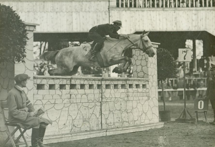 opis: Międzynarodowe Konkursy Hipiczne - polski oficer skacze na siwym koniu przez jasny mur (przeszkoda nr 7, na potniku nr 7). Przy przeszkodzie siedzi sędzia(?) - w kaszkiecie, jasnym płaszczu, długich butach i z opaską na lewym ramieniu; widać fragment trybuny.