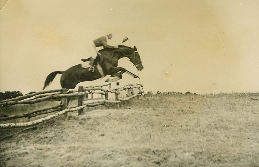 | Nr. inwentarzowy: MŁJ-XVI 1760 / 00 / 019 opis: Trening lub zawody przeprowadzane w Centrum Wyszkolenia Kawalerii dla pań z Klubu Sportowego Rodziny Wojskowej w celu zdobycia przez nie Polskiej Odznaki Jeździeckiej. Wanda Bohdanowicz (w jasnym berecie i bryczesach, ciemnym swetrze i wysokich butach skacze przez przeszkodę terenową (podwójne ogrodzenie z brzozowych drągów z proporczykiem wyznaczającym miejsce skoku) na koniu Talar III. Pagórkowaty teren, z tyłu jasny budynek z ciemnym dachem.data: czerwiec 1937 r.czas powstania - daty graniczne: 1937-06-01 - 1937-06-30miejsce: Grudziądzosoby: Wanda Bohdanowicz 1908-1991 (z domu Leska, żona rtm. Michała Bohdanowicza, miłośniczka sportów konnych, wyścigów).tworzywo: papier fotograficzny, błyszczącytechnika: odbitka żelatynowo-srebrowa DOP, tonowana?zespół: album rodziny Bohdanowiczówwymiary (wys. x szer.): 56 x 85 [mm] Koń: 1. Talar III, wałach, maść kasztanowata - hod. Bogumiła Hebanowskiego; ur. przed 1928, prywatny koń Michała Bohdanowicza, który startował na nim w konkursach ujeżdżenia, skoków (np. Mitingi Popularne PZJ 1938-39 i WKKW ("Militari"), biegach myśliwskich, skiringu, uczestniczył w ćwiczeniach wojskowych. Dosiadała go też żona Michała - Wanda (m.in. w 1937 r. w Grudziądzu)..